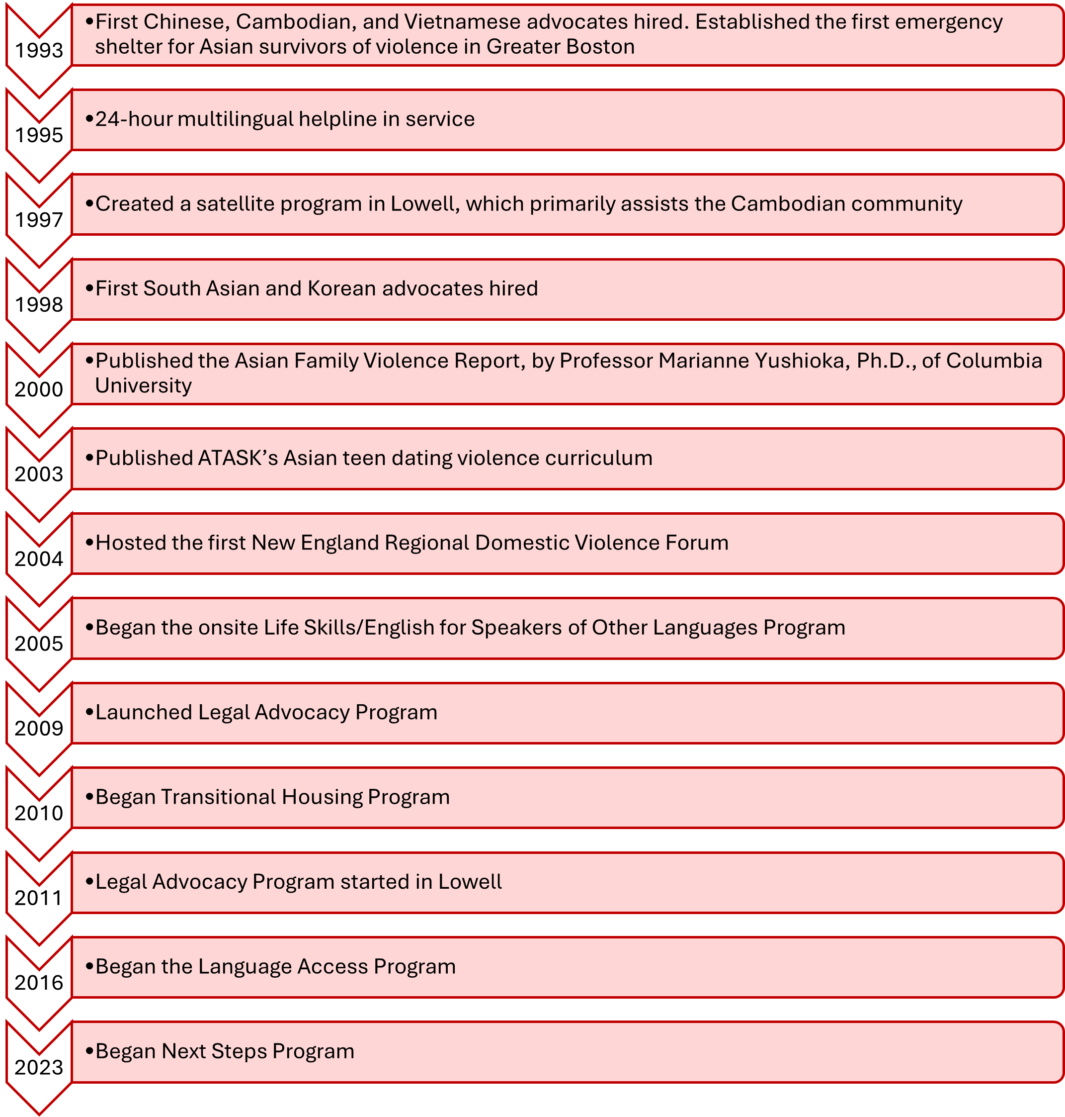 In 1986, Asians made up 2.4 percent of the total population in Massachusetts and were primarily immigrants and refugees within the Greater Boston area. Most of these immigrants had little to no knowledge of English since it was not their native language and this played a pivotal role in creating socio-cultural barriers. Asian women who became victims of domestic violence, lived within the confines of these barriers and remained unaware of the assistance they could avail from the outside world. The inception of ATASK in 1992, created the fundamental link between the unrepresented Asian victims of domestic violence and available resources for the first time in the history of Massachusetts.